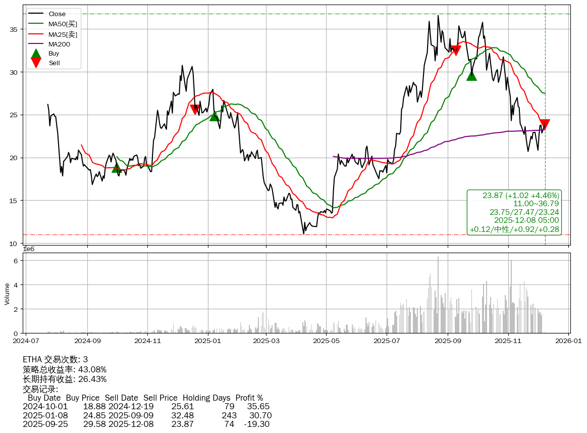 | 44 | ★ETHA | $23.73(+0.87 +3.81%) 12-08 14:59 22.86 12-05 | 📈涨破 MA5/25/200 均线 📉回撤 08-24 -34.75% (105天) 36.58(08-21)→20.70(11-20) | +43.08% | +26.43% | +16.65% | 3 | 中性/0.92/0.28 | 2024-07-23~2025-12-08 |