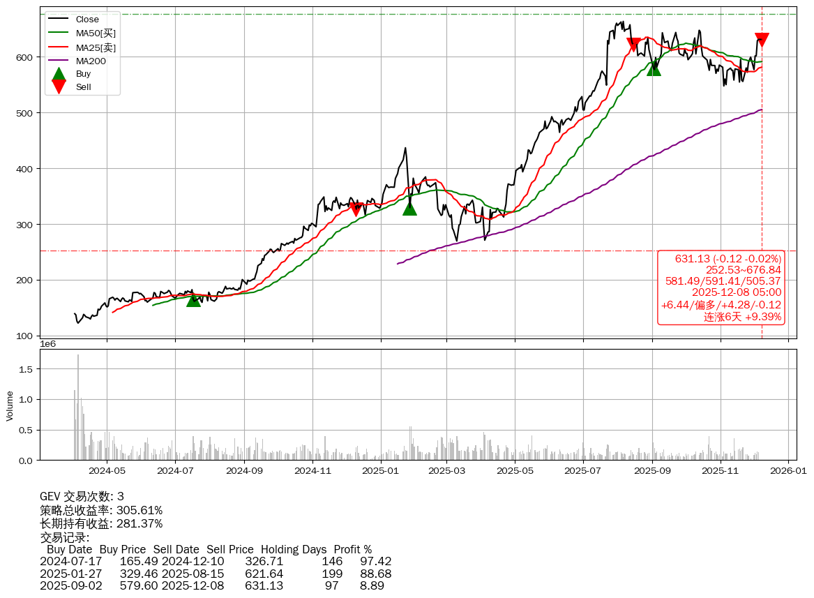| 8 | ★GEV | $621.91(-9.43 -1.49%) 12-08 14:59 631.34 12-05 | 📈连涨6天 +9.39% 📉回撤 08-06 -4.89% (123天) 663.56(08-05)→547.80(11-03) | +305.61% | +281.37% | +24.24% | 3 | 偏多/4.28/-0.12 | 2024-04-02~2025-12-08 |