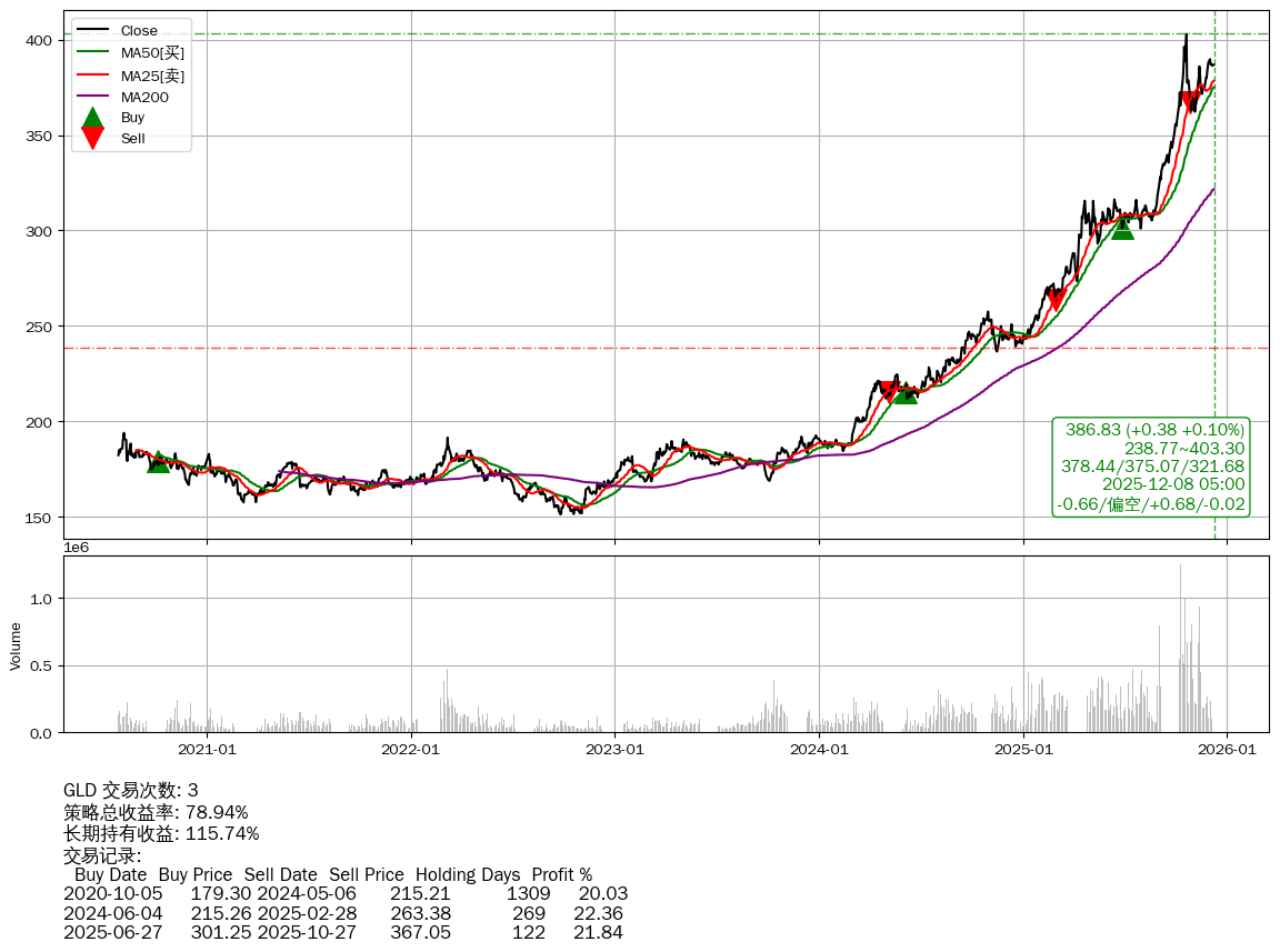 | 35 | ★GLD | $385.42(-1.04 -0.27%) 12-08 14:59 386.46 12-05 | 📉回撤 10-20 -4.00% (48天) 402.95(10-19)→362.27(11-03) | +78.94% | +115.74% | -36.80% | 3 | 偏空/0.68/-0.02 | 2020-07-27~2025-12-08 |