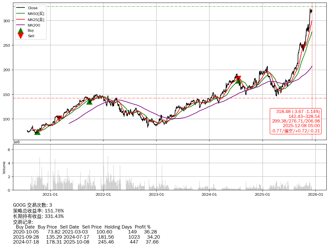 | 22 | ★GOOG | $314.29(-7.77 -2.41%) 12-08 14:59 322.06 12-05 | 📉跌破 MA5/10 均线 📉回撤 11-25 -1.61% (12天) 323.69(11-24)→315.18(11-30) | +151.76% | +331.43% | -179.66% | 3 | 偏空/0.72/-0.21 | 2020-07-27~2025-12-08 |