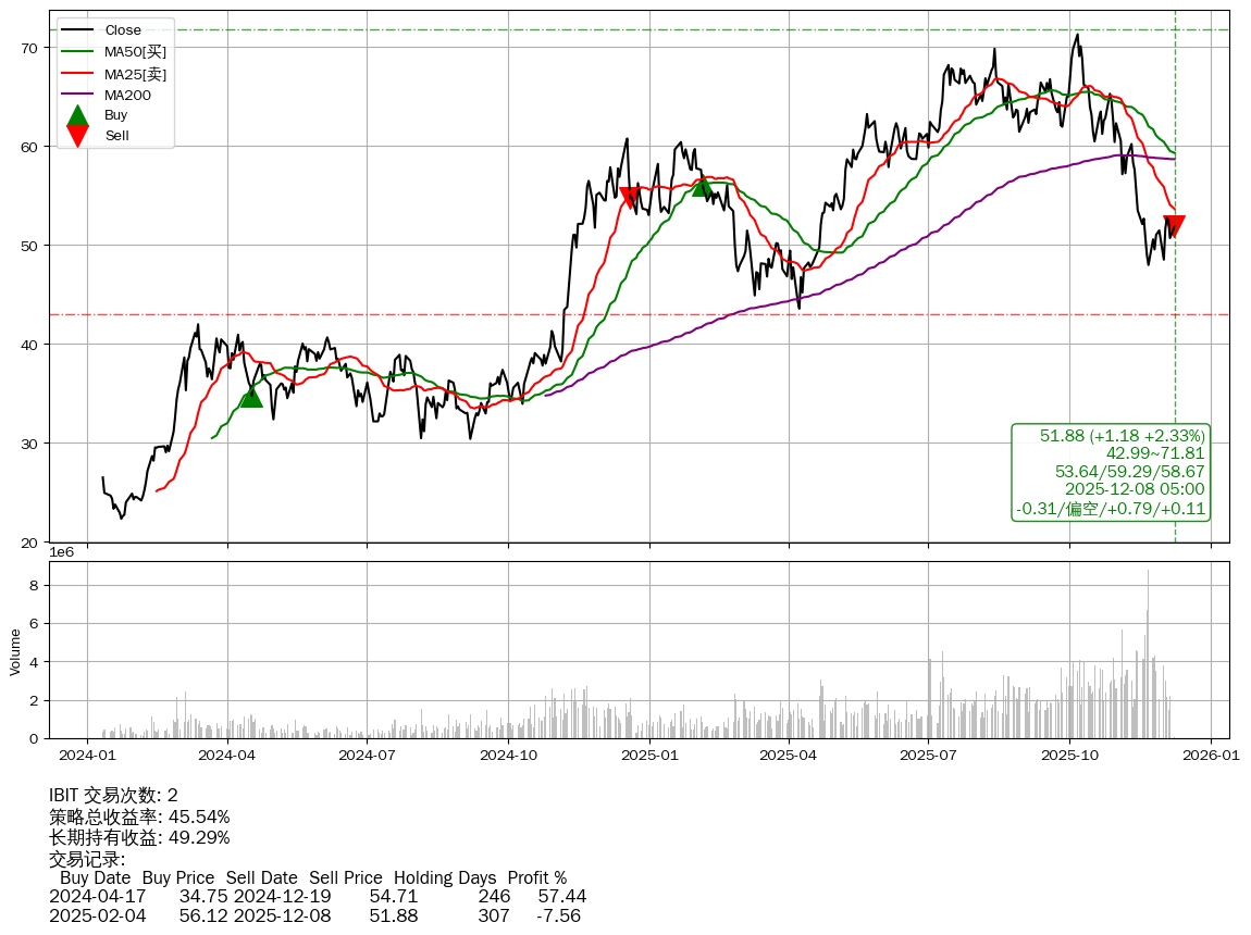 | 42 | ★IBIT | $51.52(+0.82 +1.62%) 12-08 14:59 50.70 12-05 | 📈涨破 MA10 均线 📉回撤 10-06 -27.23% (62天) 71.29(10-05)→47.98(11-20) | +45.54% | +49.29% | -3.76% | 2 | 偏空/0.76/0.11 | 2024-01-11~2025-12-08 |