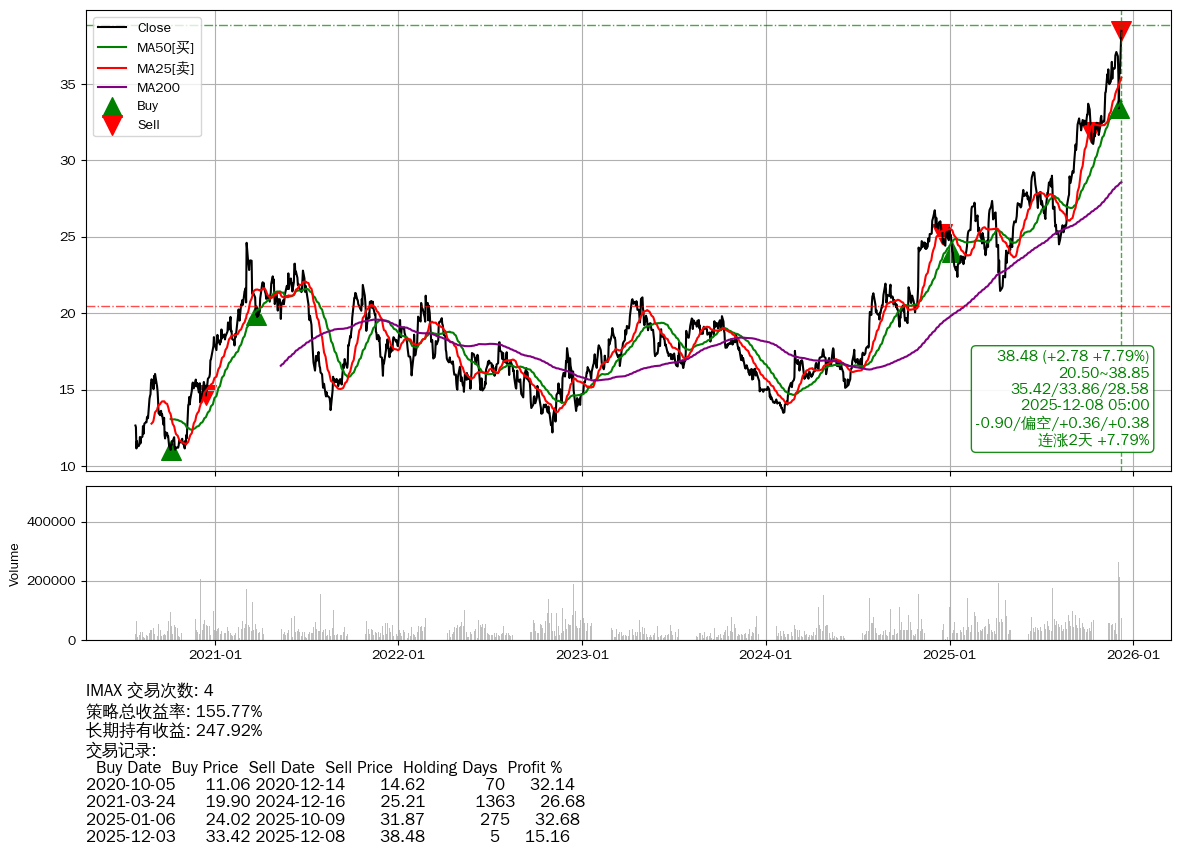 | 20 | 🟢IMAX | $38.50(+2.81 +7.87%) 12-08 14:59 35.69 12-05 | 📈涨破 MA5/10 均线 📈涨破 52周高点 (38.85) 📈连涨2天 +7.79% | +155.77% | +247.92% | -92.15% | 4 | 偏空/0.36/0.38 | 2020-07-27~2025-12-08 |