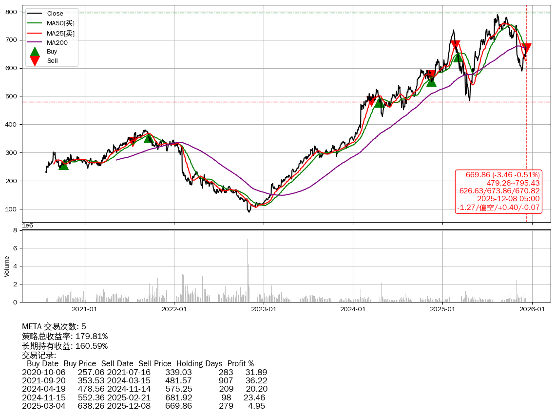 | 16 | ★META | $667.03(-6.43 -0.95%) 12-08 14:59 673.46 12-05 | 📉跌破 MA200 均线 📉回撤 08-12 -15.13% (117天) 789.26(08-11)→589.15(11-19) | +179.81% | +160.59% | +19.23% | 5 | 偏空/0.4/-0.07 | 2020-07-27~2025-12-08 |