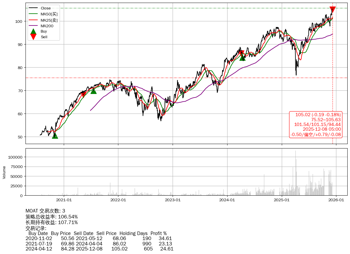 | 31 | ★MOAT | $104.35(-0.85 -0.81%) 12-08 14:59 105.19 12-05 | 📉回撤 12-07 -0.18% (0天) 105.21(12-04)→105.02(12-07) | +106.54% | +107.71% | -1.18% | 3 | 偏空/0.79/-0.08 | 2020-07-27~2025-12-08 |