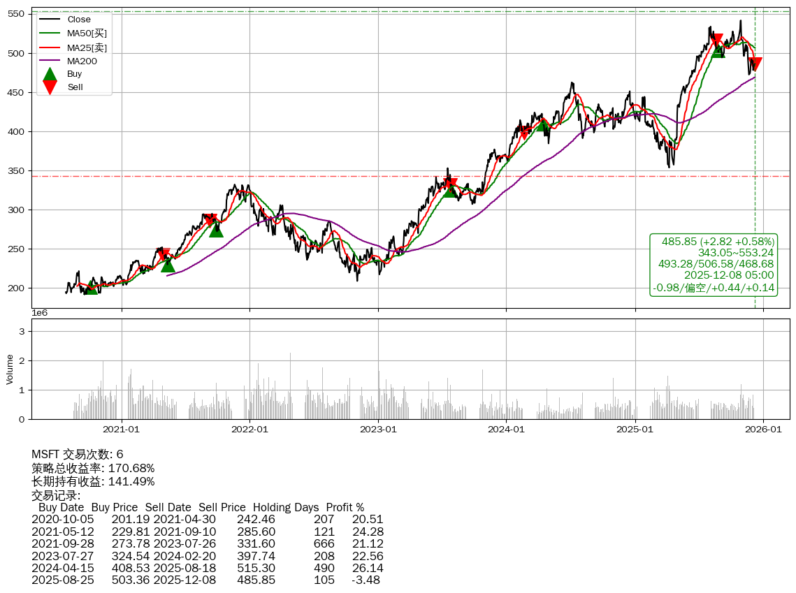 | 17 | ★MSFT | $491.12(+8.09 +1.67%) 12-08 14:59 483.03 12-05 | 📈涨破 MA5/10 均线 📉回撤 10-29 -10.26% (39天) 541.40(10-28)→472.19(11-20) | +170.68% | +141.49% | +29.19% | 6 | 偏空/0.44/0.14 | 2020-07-27~2025-12-08 |