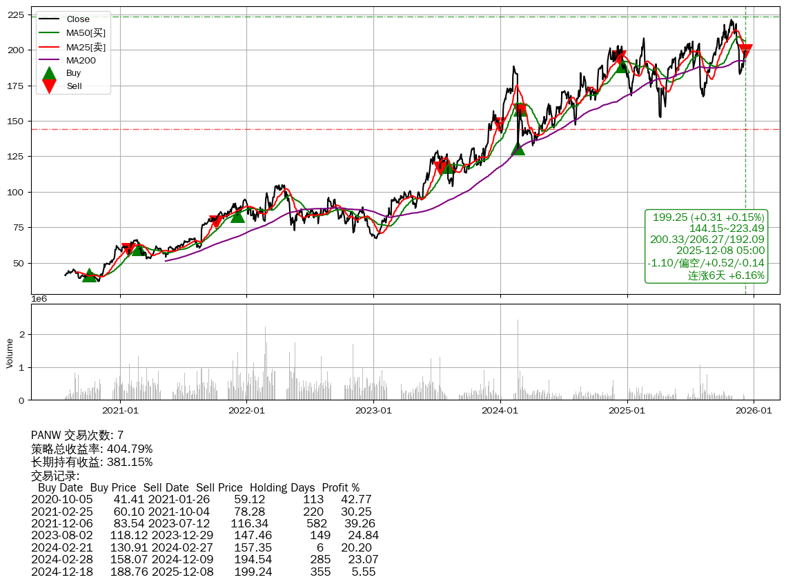 | 5 | ★PANW | $195.37(-3.49 -1.76%) 12-08 14:59 198.86 12-05 | 📈连涨6天 +6.16% 📉回撤 10-28 -9.98% (40天) 221.34(10-27)→182.88(11-20) | +404.79% | +381.15% | +23.64% | 7 | 偏空/0.52/-0.14 | 2020-07-27~2025-12-08 |