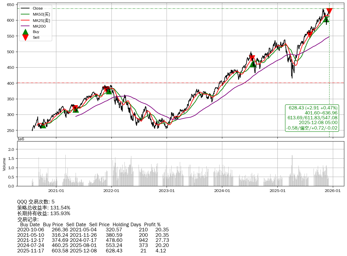 | 25 | ★QQQ | $624.18(-1.35 -0.22%) 12-08 14:59 625.53 12-05 | 📉回撤 10-29 -1.17% (39天) 635.87(10-28)→585.82(11-19) | +131.54% | +135.93% | -4.39% | 5 | 偏空/0.72/-0.02 | 2020-07-27~2025-12-08 |