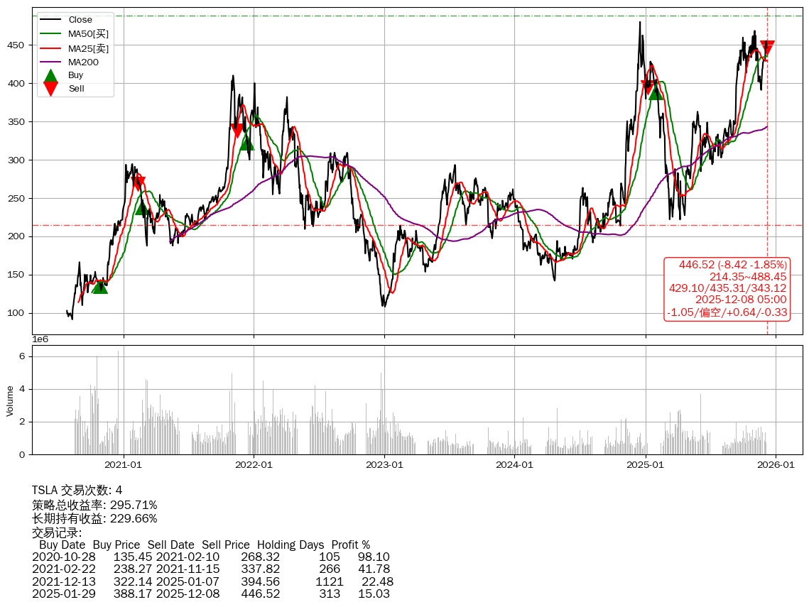 | 9 | ★TSLA | $439.59(-15.35 -3.37%) 12-08 14:59 454.94 12-05 | 📉回撤 2024-12-17 -6.95% (355天) 479.86(2024-12-16)→221.89(04-07) | +295.71% | +229.66% | +66.05% | 4 | 偏空/0.64/-0.33 | 2020-07-27~2025-12-08 |
