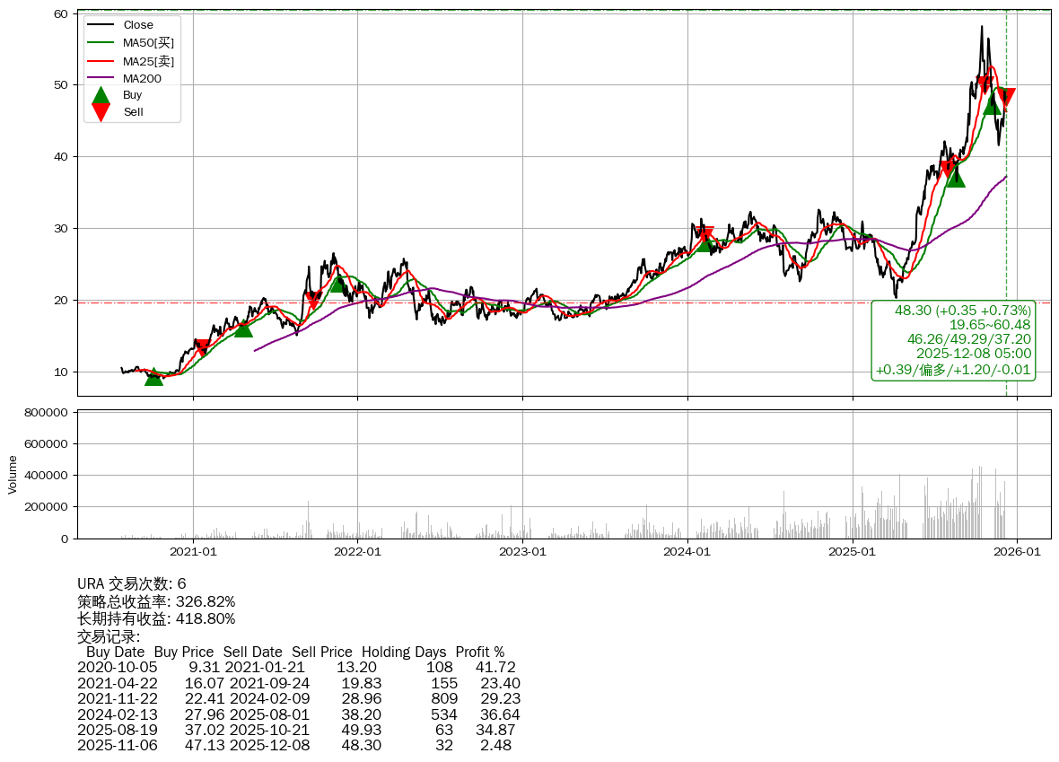 | 7 | ★URA | $47.78(-0.11 -0.23%) 12-08 14:59 47.89 12-05 | 📉回撤 10-15 -16.97% (53天) 58.17(10-14)→41.56(11-20) | +326.82% | +418.80% | -91.98% | 6 | 偏多/1.19/-0.01 | 2020-07-27~2025-12-08 |