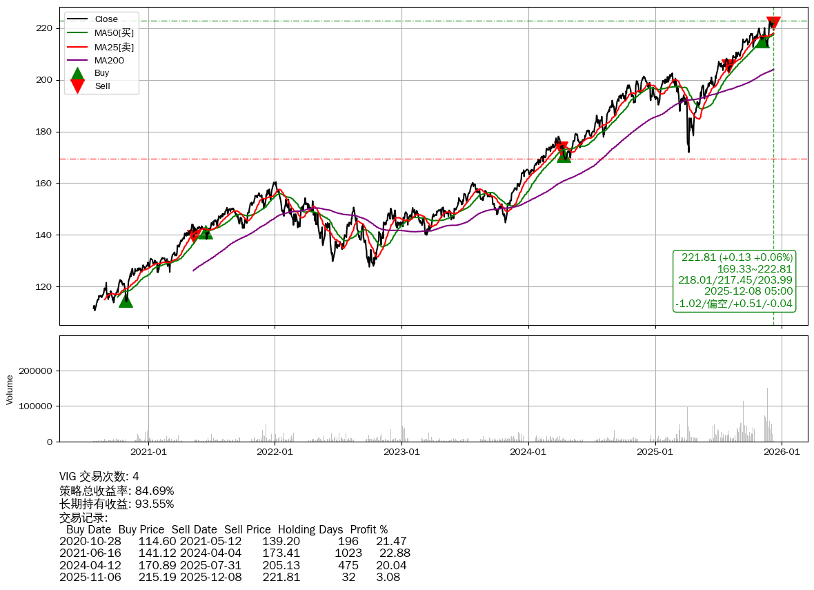 | 33 | ★VIG | $220.92(-0.72 -0.32%) 12-08 14:59 221.64 12-05 | 📉回撤 11-30 -0.37% (7天) 222.64(11-27)→220.33(12-01) | +84.69% | +93.55% | -8.86% | 4 | 偏空/0.51/-0.04 | 2020-07-27~2025-12-08 |