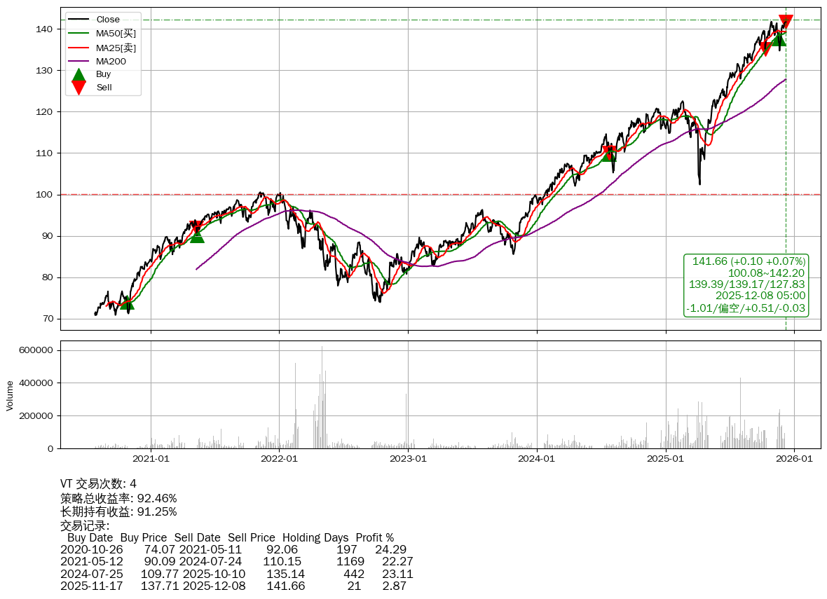 | 32 | ★VT | $141.15(-0.41 -0.29%) 12-08 14:59 141.55 12-05 | 📉回撤 10-28 -0.07% (40天) 141.75(10-27)→134.73(11-19) | +92.46% | +91.25% | +1.21% | 4 | 偏空/0.51/-0.03 | 2020-07-27~2025-12-08 |