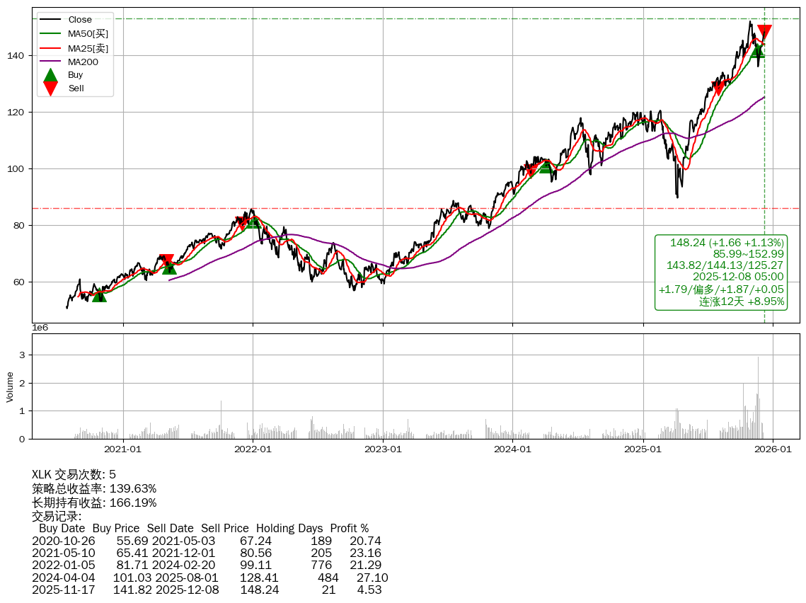 | 24 | ★XLK | $147.66(+1.08 +0.74%) 12-08 14:59 146.58 12-05 | 📈连涨12天 +8.95% 📉回撤 10-29 -2.52% (39天) 152.07(10-28)→136.06(11-19) | +139.63% | +166.19% | -26.56% | 5 | 偏多/1.87/0.05 | 2020-07-27~2025-12-08 |