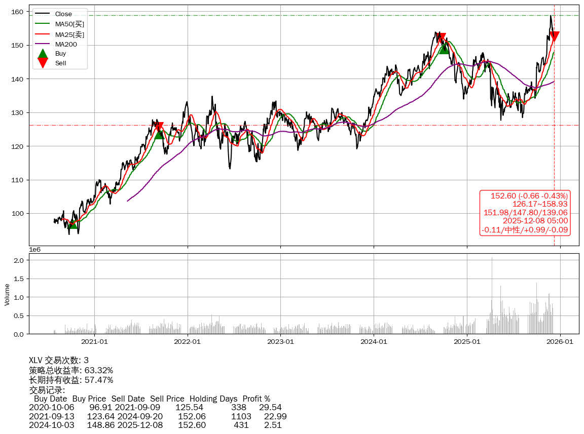 | 37 | ★XLV | $151.46(-1.81 -1.18%) 12-08 14:59 153.27 12-05 | 📉回撤 11-25 -3.88% (12天) 158.76(11-24)→152.60(12-07) | +63.32% | +57.47% | +5.85% | 3 | 中性/0.99/-0.09 | 2020-07-27~2025-12-08 |