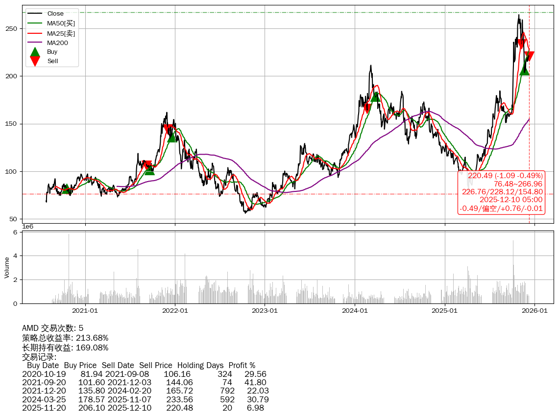 | 12 | ★AMD | $221.42(-0.14 -0.06%) 12-10 14:59 221.56 12-09 | 📉回撤 10-29 -16.58% (41天) 264.31(10-28)→203.77(11-20) | +213.68% | +169.08% | +44.60% | 5 | 偏空/0.77/-0.01 | 2020-07-27~2025-12-10 |