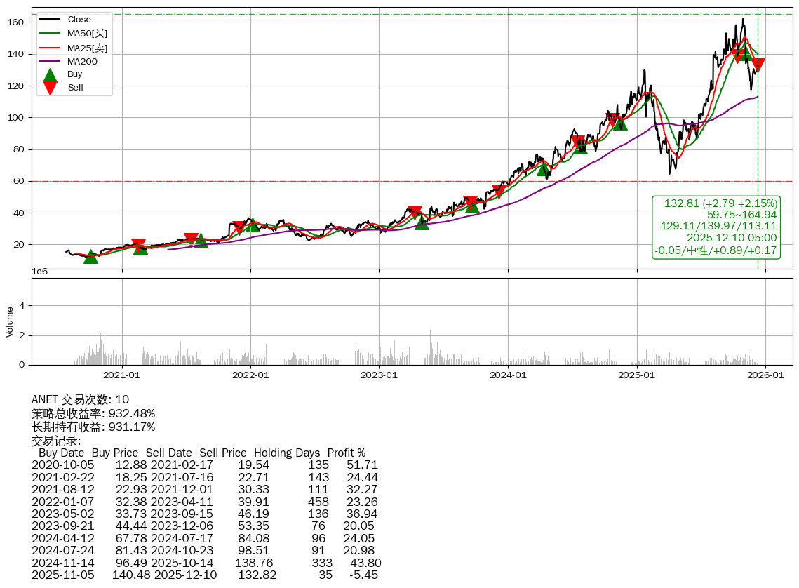 | 2 | ★ANET | $132.41(+2.36 +1.81%) 12-10 14:59 130.05 12-09 | 📉回撤 10-29 -18.01% (41天) 161.99(10-28)→117.43(11-20) | +932.48% | +931.17% | +1.31% | 10 | 中性/0.89/0.17 | 2020-07-27~2025-12-10 |
