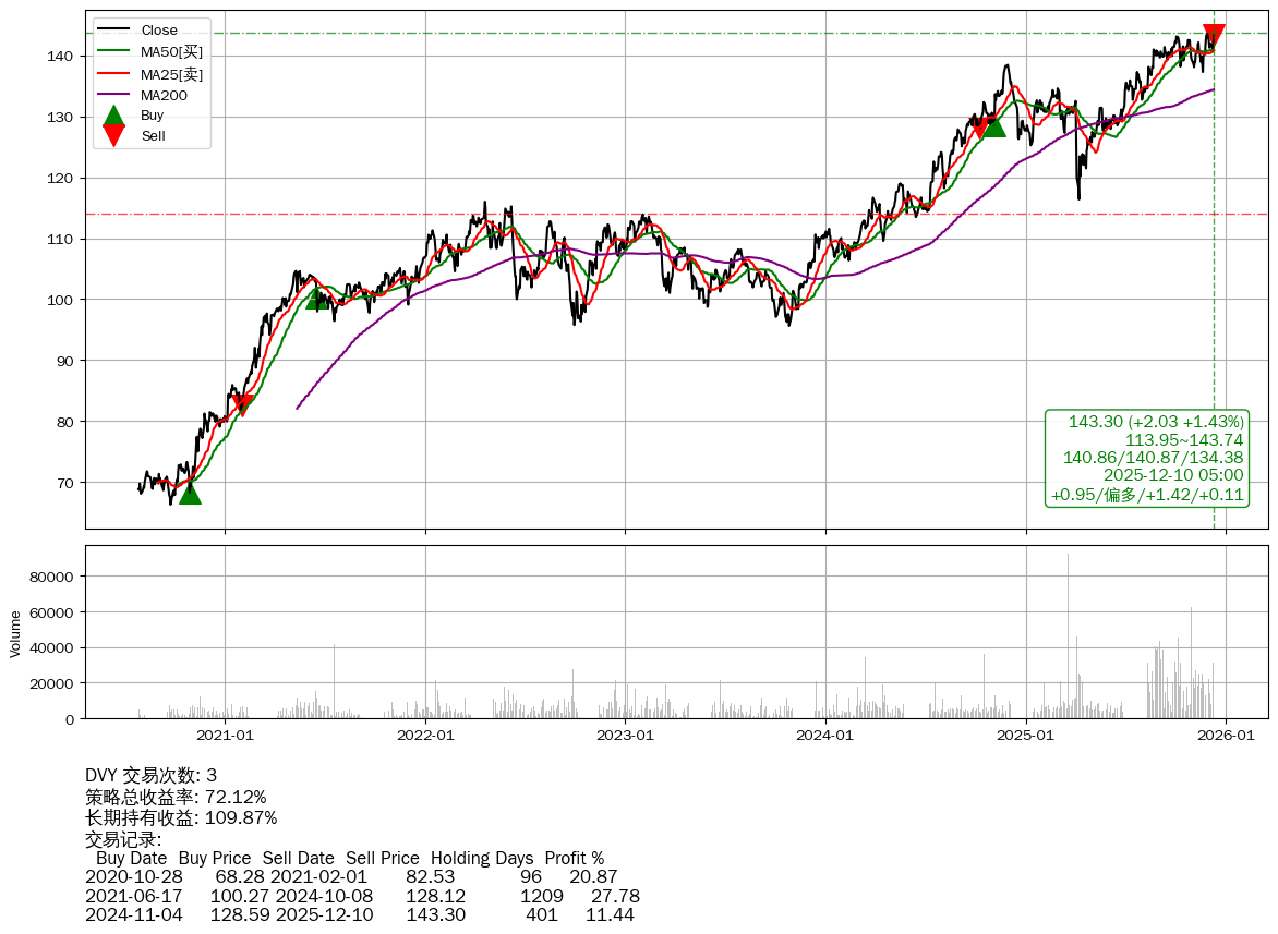 | 34 | 🟢DVY | $143.28(+2.01 +1.42%) 12-10 14:59 141.27 12-09 | 📈涨破 MA5/10 均线 📉回撤 11-30 -0.20% (9天) 143.58(11-27)→140.94(12-07) | +72.12% | +109.87% | -37.75% | 3 | 偏多/1.42/0.11 | 2020-07-27~2025-12-10 |