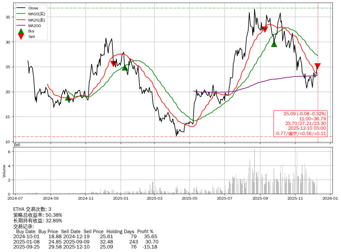 | 39 | ★ETHA | $25.38(+0.21 +0.83%) 12-10 14:59 25.17 12-09 | 📉回撤 08-24 -31.41% (107天) 36.58(08-21)→20.70(11-20) | +50.38% | +32.89% | +17.49% | 3 | 偏空/0.56/0.11 | 2024-07-23~2025-12-10 |