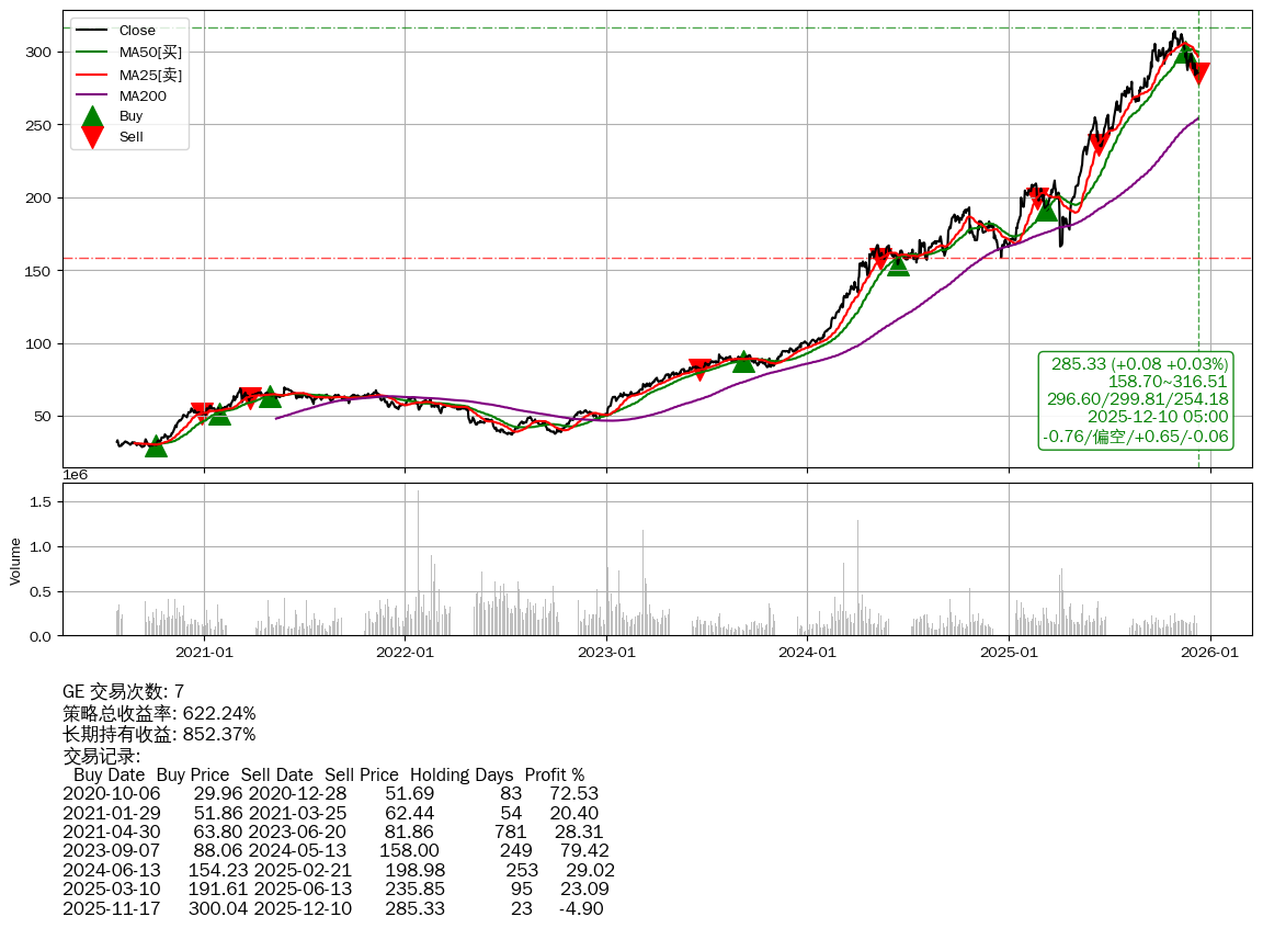 | 4 | ★GE | $283.55(-1.78 -0.62%) 12-10 14:59 285.33 12-09 | 📉回撤 10-29 -9.14% (41天) 314.04(10-28)→283.94(12-04) | +622.24% | +852.37% | -230.13% | 7 | 偏空/0.65/-0.06 | 2020-07-27~2025-12-10 |