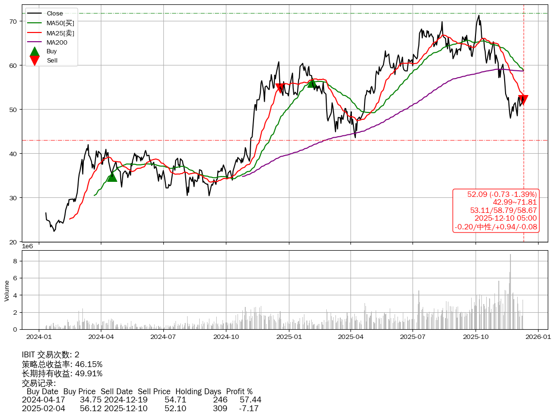 | 42 | ★IBIT | $52.49(-0.35 -0.66%) 12-10 14:59 52.84 12-09 | 📉回撤 10-06 -26.93% (64天) 71.29(10-05)→47.98(11-20) | +46.15% | +49.91% | -3.76% | 2 | 中性/0.94/-0.08 | 2024-01-11~2025-12-10 |