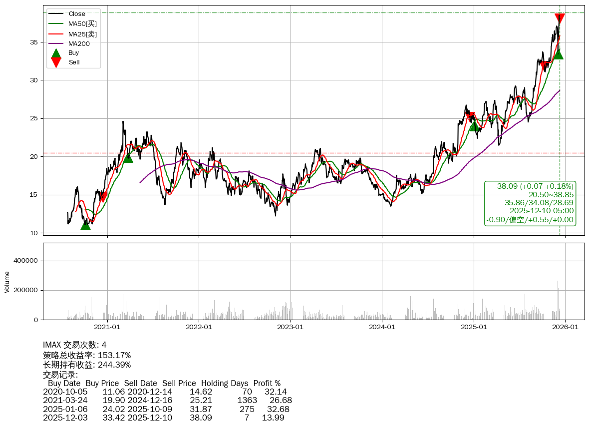 | 20 | IMAX | $38.10(+0.05 +0.13%) 12-10 14:59 38.05 12-09 | 📉回撤 12-08 -1.01% (1天) 38.48(12-07)→38.02(12-08) | +153.17% | +244.39% | -91.22% | 4 | 偏空/0.55/0.00 | 2020-07-27~2025-12-10 |