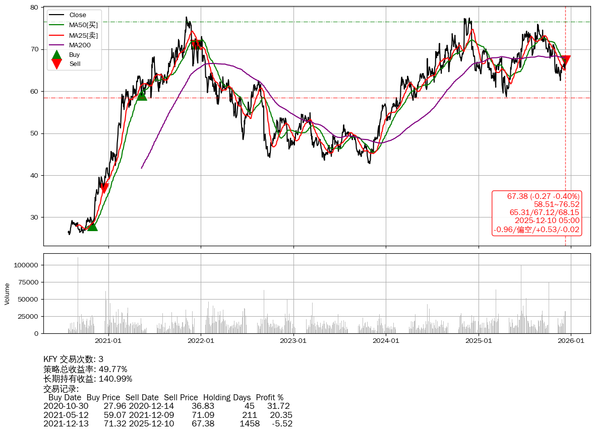 | 40 | KFY | $67.44(-0.12 -0.18%) 12-10 14:59 67.56 12-09 | 📉回撤 2021-11-07 -13.26% (1493天) 77.68(2021-11-04)→42.77(2023-10-29) | +49.77% | +140.99% | -91.21% | 3 | 偏空/0.53/-0.02 | 2020-07-27~2025-12-10 |