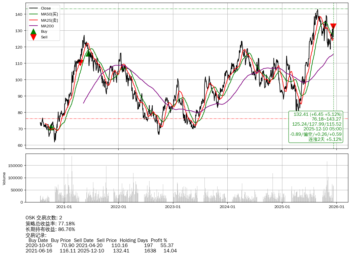 | 33 | 🟢OSK | $132.50(+6.52 +5.18%) 12-10 14:59 125.98 12-09 | 📈涨破 MA5/10/50/100 均线 📈连涨2天 +5.12% 📉回撤 08-27 -7.31% (104天) 142.86(08-26)→118.54(11-19) | +77.18% | +86.76% | -9.57% | 2 | 偏空/0.26/0.59 | 2020-07-27~2025-12-10 |