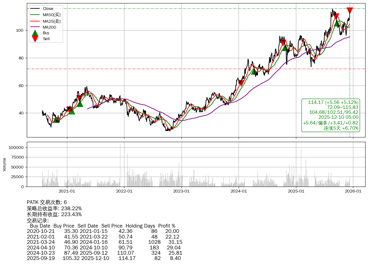 | 10 | 🟢PATK | $114.18(+5.60 +5.16%) 12-10 14:59 108.58 12-09 | 📈涨破 MA5 均线 📈连涨5天 +6.70% 📉回撤 08-24 -1.02% (107天) 115.35(08-21)→96.26(11-16) | +238.22% | +223.43% | +14.80% | 6 | 偏多/3.41/0.82 | 2020-07-27~2025-12-10 |