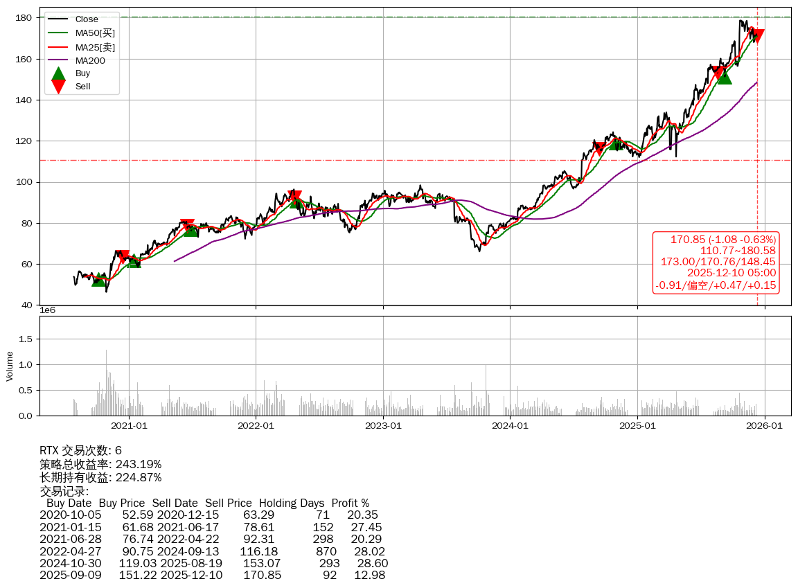 | 9 | ★RTX | $174.74(+2.80 +1.63%) 12-10 14:59 171.94 12-09 | 📉跌破 MA5/10 均线 📉回撤 10-23 -4.40% (47天) 178.71(10-22)→168.00(11-30) | +243.19% | +224.87% | +18.32% | 6 | 偏空/0.47/0.15 | 2020-07-27~2025-12-10 |