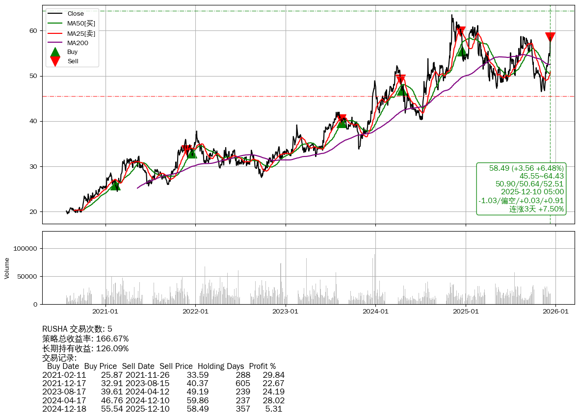 | 17 | 🟢RUSHA | $58.52(+3.59 +6.54%) 12-10 14:59 54.93 12-09 | 📈涨破 MA5 均线 📈连涨3天 +7.50% 📉回撤 2024-11-06 -7.92% (398天) 63.52(2024-11-05)→46.51(11-03) | +166.67% | +126.09% | +40.58% | 5 | 偏空/0.03/0.91 | 2020-07-27~2025-12-10 |