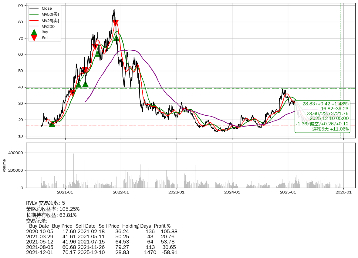 | 28 | RVLV | $28.82(+0.42 +1.48%) 12-10 14:59 28.40 12-09 | 📈连涨5天 +11.06% 📉回撤 2021-11-18 -67.15% (1482天) 87.76(2021-11-17)→12.52(2023-09-21) | +105.25% | +63.81% | +41.44% | 5 | 偏空/0.26/0.12 | 2020-07-27~2025-12-10 |