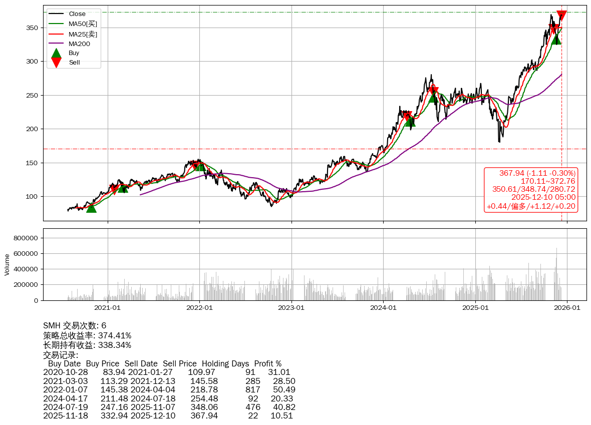 | 5 | ★SMH | $374.21(+5.10 +1.38%) 12-10 14:59 369.11 12-09 | 📉回撤 10-29 -0.31% (41天) 369.08(10-28)→324.76(11-19) | +374.41% | +338.34% | +36.07% | 6 | 偏多/1.05/0.20 | 2020-07-27~2025-12-10 |