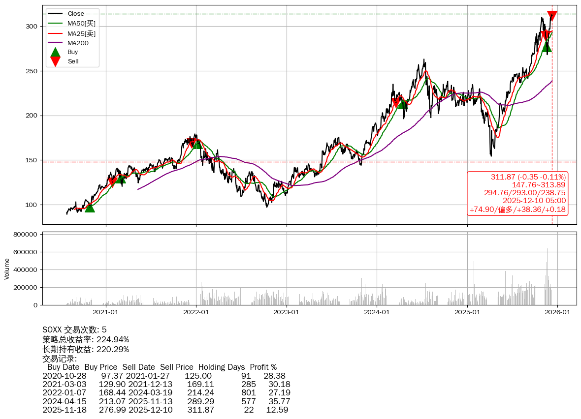 | 11 | ★SOXX | $316.29(+4.10 +1.31%) 12-10 14:59 312.19 12-09 | 📉回撤 12-08 -0.28% (1天) 312.74(12-07)→311.87(12-09) | +224.94% | +220.29% | +4.64% | 5 | 偏多/38.36/0.18 | 2020-07-27~2025-12-10 |