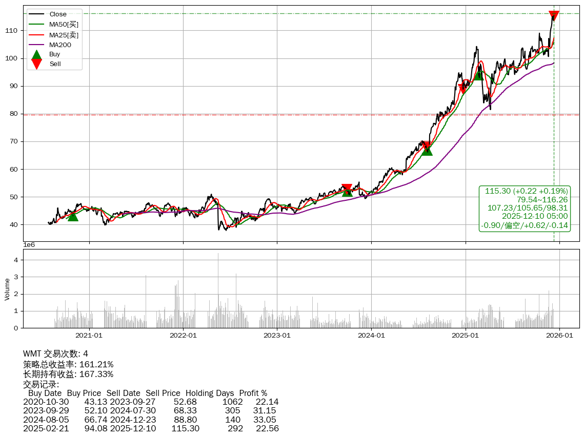 | 19 | ★WMT | $113.15(-1.94 -1.69%) 12-10 14:59 115.09 12-09 | +161.21% | +167.33% | -6.12% | 4 | 偏空/0.62/-0.14 | 2020-07-27~2025-12-10 | |