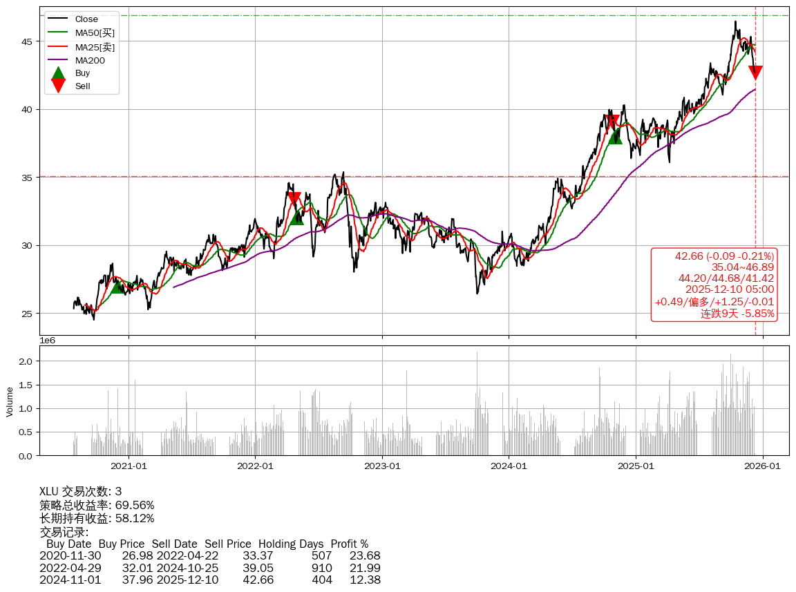 | 35 | ★XLU | $42.72(-0.03 -0.07%) 12-10 14:59 42.74 12-09 | 📉连跌9天 -5.85% 📉回撤 10-15 -8.14% (55天) 46.44(10-14)→42.66(12-09) | +69.56% | +58.12% | +11.44% | 3 | 偏多/1.25/-0.01 | 2020-07-27~2025-12-10 |