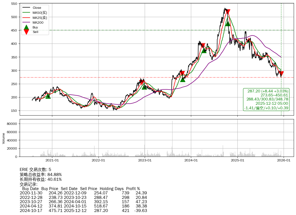 | 29 | 🟢ERIE | $287.33(+8.57 +3.07%) 12-12 14:59 278.76 12-11 | 📈涨破 MA5 均线 📉回撤 2024-09-24 -46.09% (443天) 532.76(2024-09-23)→275.10(12-09) | +84.88% | +40.61% | +44.27% | 5 | 偏空/0.1/0.39 | 2020-07-27~2025-12-12 |