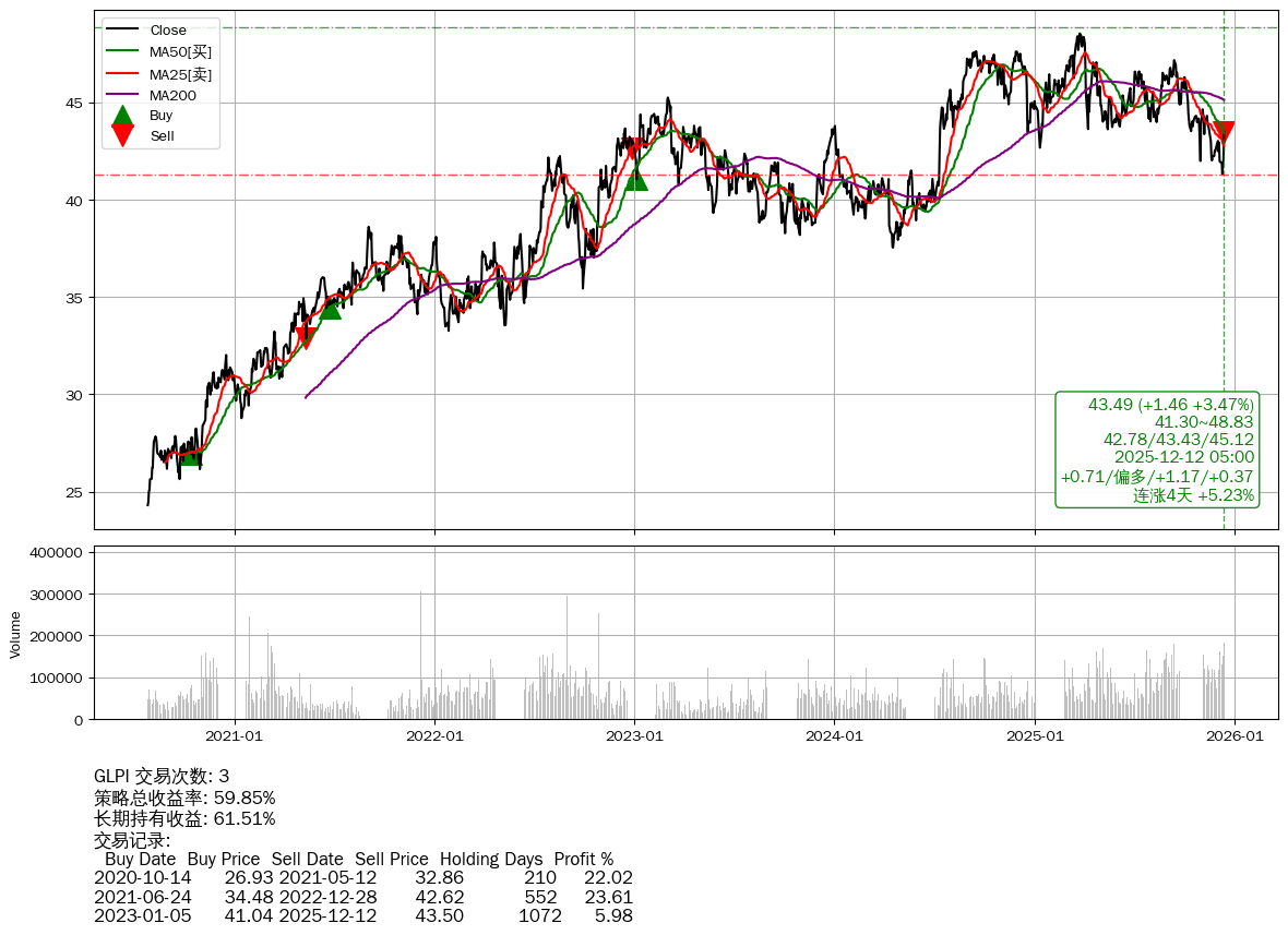 | 35 | 🟢GLPI | $43.49(+1.46 +3.47%) 12-12 14:59 42.03 12-11 | 📈涨破 MA5/10/25/50 均线 📈连涨4天 +5.23% 📉回撤 03-24 -10.39% (262天) 48.54(03-23)→41.34(12-08) | +59.85% | +61.51% | -1.66% | 3 | 偏多/1.17/0.37 | 2020-07-27~2025-12-12 |