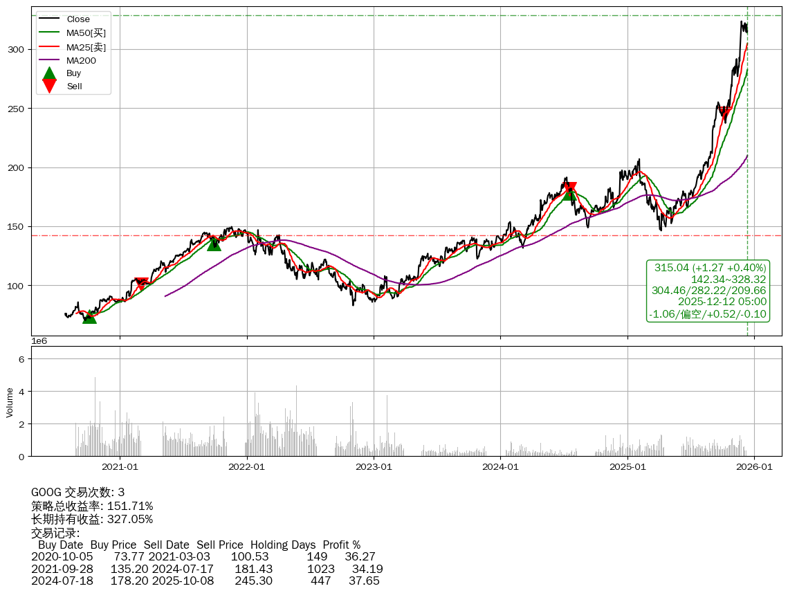 | 20 | ★GOOG | $310.51(-3.20 -1.02%) 12-12 14:59 313.71 12-11 | 📉回撤 11-25 -2.61% (16天) 323.47(11-24)→313.77(12-10) | +151.71% | +327.05% | -175.34% | 3 | 偏空/0.52/-0.10 | 2020-07-27~2025-12-12 |