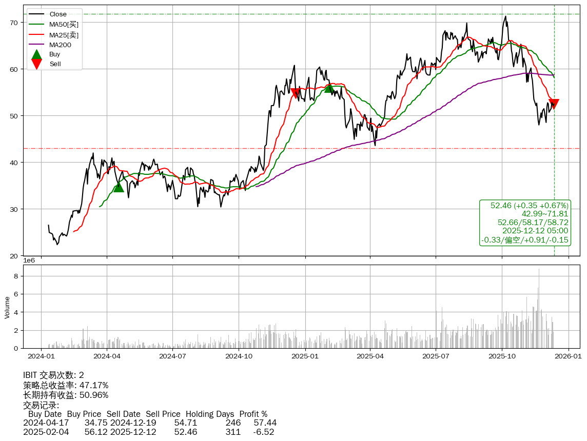 | 39 | ★IBIT | $51.19(-0.91 -1.75%) 12-12 14:59 52.10 12-11 | 📈涨破 MA5 均线 📉回撤 10-06 -26.41% (66天) 71.29(10-05)→47.98(11-20) | +47.17% | +50.96% | -3.79% | 2 | 偏空/0.91/-0.15 | 2024-01-11~2025-12-12 |