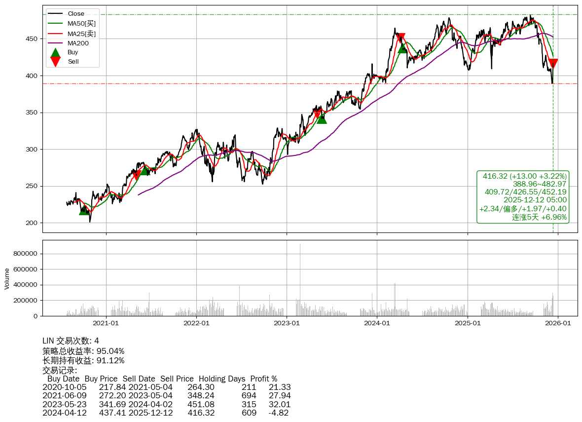 | 27 | 🟢LIN | $416.32(+13.02 +3.23%) 12-12 14:59 403.30 12-11 | 📈涨破 MA25 均线 📈连涨5天 +6.96% 📉回撤 09-11 -13.61% (91天) 481.93(09-10)→389.25(12-07) | +95.04% | +91.12% | +3.93% | 4 | 偏多/1.97/0.40 | 2020-07-27~2025-12-12 |