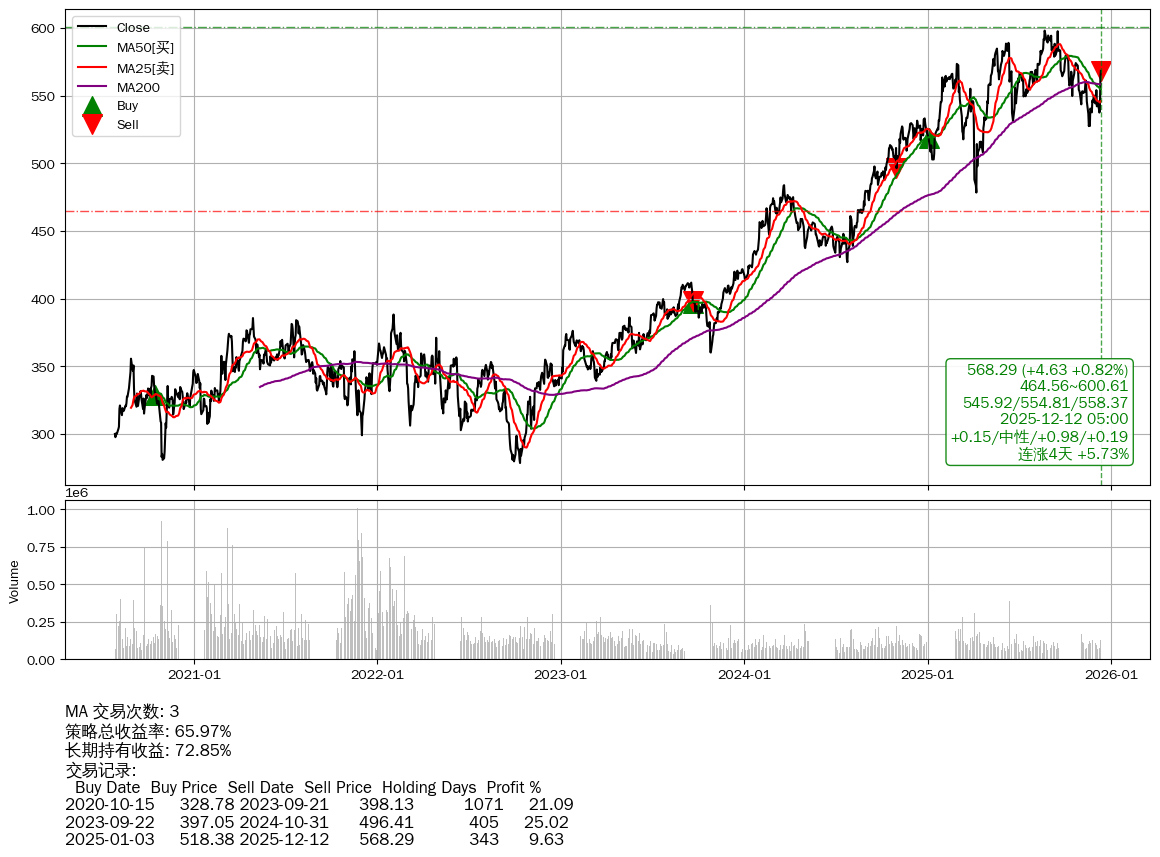 | 33 | ★MA | $571.92(+8.19 +1.45%) 12-12 14:59 563.73 12-11 | 📈涨破 MA100 均线 📈连涨4天 +5.73% 📉回撤 08-24 -4.98% (109天) 598.06(08-21)→527.52(11-17) | +65.97% | +72.85% | -6.88% | 3 | 中性/0.98/0.19 | 2020-07-27~2025-12-12 |