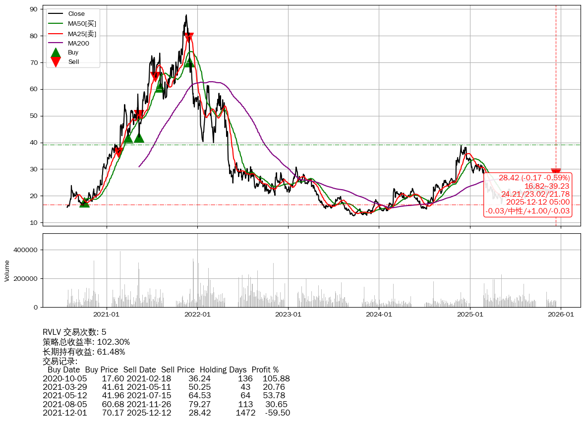 | 26 | RVLV | $28.45(-0.13 -0.45%) 12-12 14:59 28.58 12-11 | 📉回撤 2021-11-18 -67.62% (1484天) 87.76(2021-11-17)→12.52(2023-09-21) | +102.30% | +61.48% | +40.83% | 5 | 中性/1.0/-0.03 | 2020-07-27~2025-12-12 |