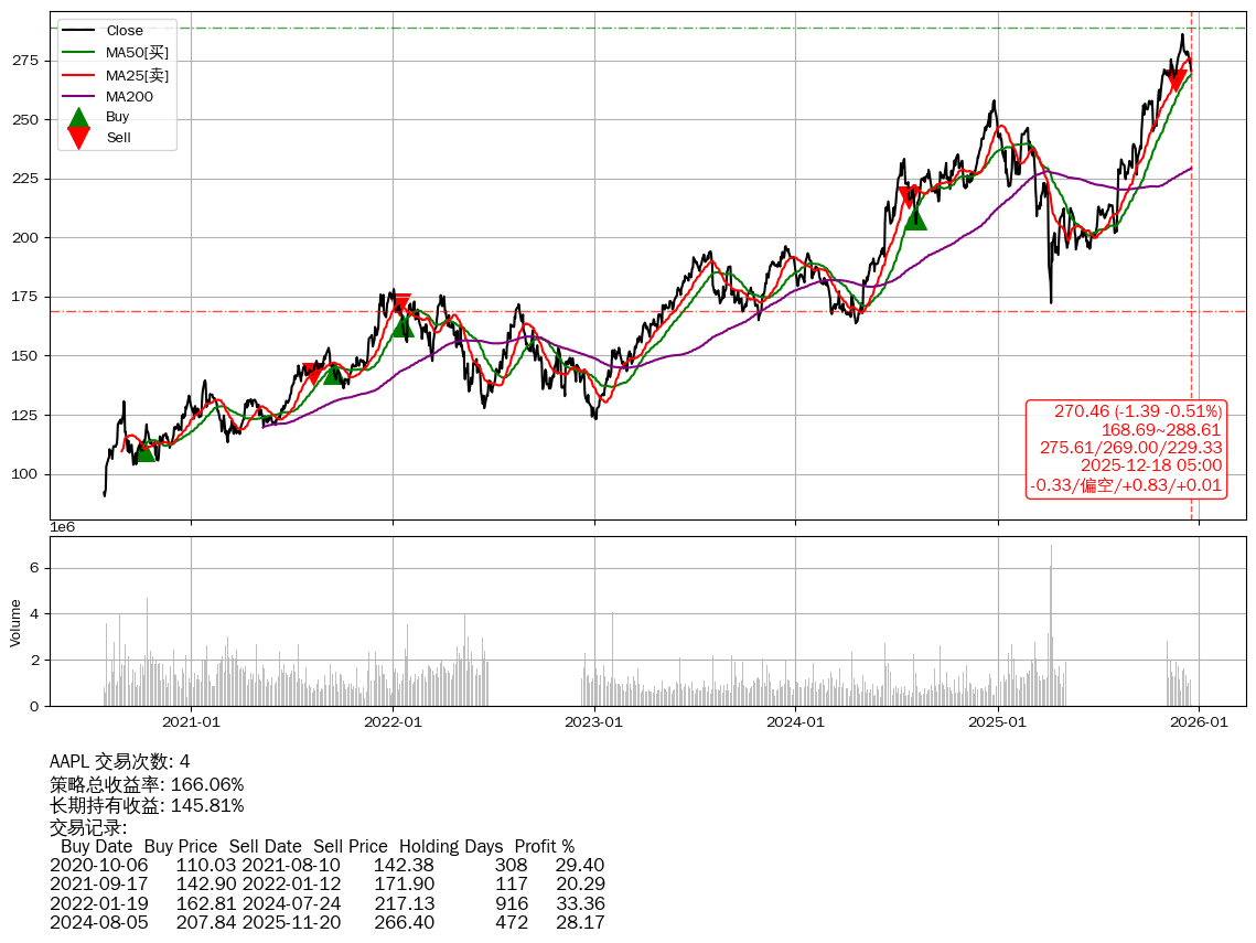 | 17 | ★AAPL | $272.16(+0.30 +0.11%) 12-18 14:59 271.86 12-17 | 📉回撤 12-02 -5.46% (15天) 286.09(12-01)→270.46(12-17) | +166.06% | +145.81% | +20.25% | 4 | 偏空/0.83/0.01 | 2020-07-27~2025-12-18 |