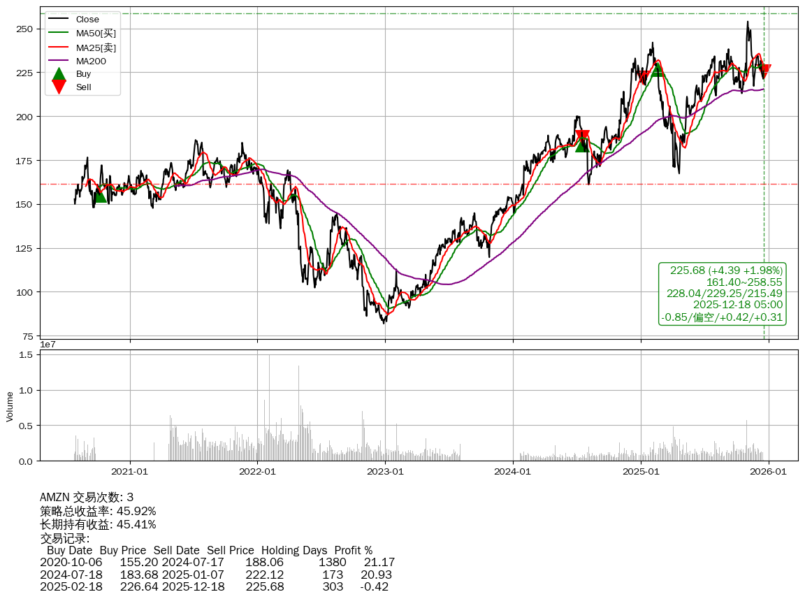 | 33 | ★AMZN | $226.76(+5.52 +2.50%) 12-18 14:59 221.24 12-17 | 📈涨破 MA5 均线 📉回撤 11-03 -11.15% (44天) 253.99(11-02)→217.19(11-19) | +45.92% | +45.41% | +0.50% | 3 | 偏空/0.42/0.31 | 2020-07-27~2025-12-18 |