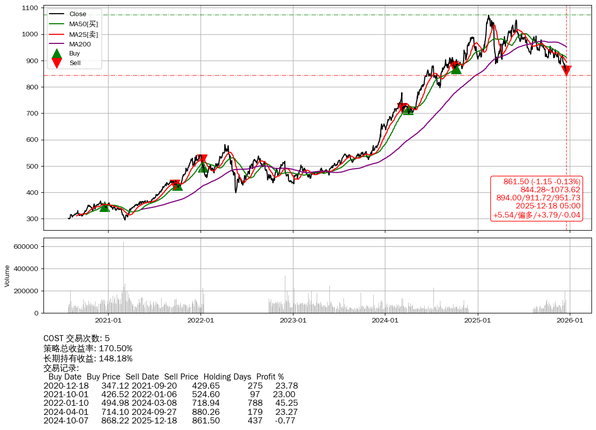 | 15 | ★COST | $857.40(-5.24 -0.61%) 12-18 14:59 862.64 12-17 | 📉回撤 02-13 -19.63% (307天) 1071.88(02-12)→860.30(12-15) | +170.50% | +148.18% | +22.32% | 5 | 偏多/3.77/-0.04 | 2020-07-27~2025-12-18 |