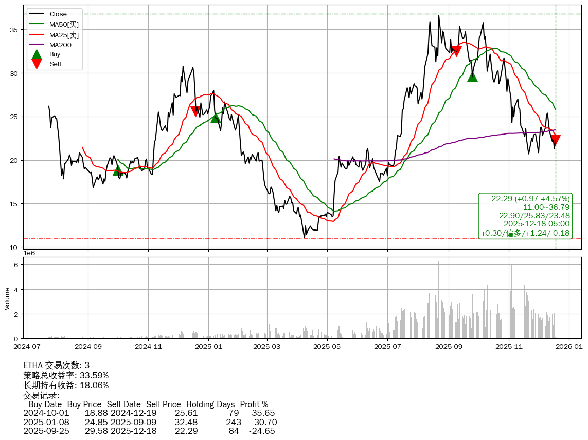 | 36 | ★ETHA | $21.00(-0.31 -1.45%) 12-18 14:59 21.31 12-17 | 📈涨破 MA5 均线 📉回撤 08-24 -39.07% (115天) 36.58(08-21)→20.70(11-20) | +33.59% | +18.06% | +15.53% | 3 | 偏多/1.24/-0.18 | 2024-07-23~2025-12-18 |