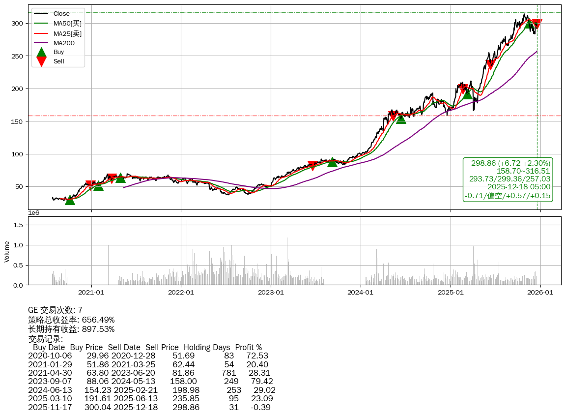 | 3 | ★GE | $301.69(+9.56 +3.27%) 12-18 14:59 292.13 12-17 | 📈涨破 MA5/25 均线 📉回撤 10-29 -4.83% (49天) 314.04(10-28)→283.44(12-09) | +656.49% | +897.53% | -241.04% | 7 | 偏空/0.54/0.15 | 2020-07-27~2025-12-18 |