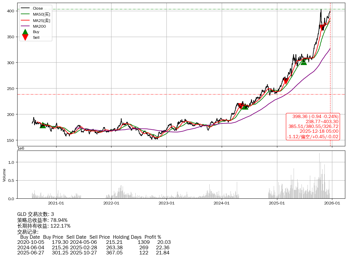 | 28 | ★GLD | $398.53(-0.73 -0.18%) 12-18 14:59 399.26 12-17 | 📉回撤 10-20 -1.14% (58天) 402.95(10-19)→362.27(11-03) | +78.94% | +122.17% | -43.23% | 3 | 偏空/0.45/-0.02 | 2020-07-27~2025-12-18 |