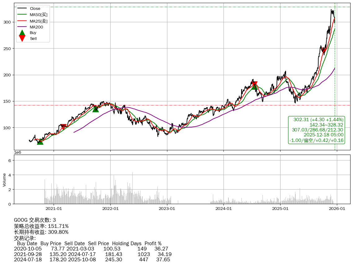 | 20 | ★GOOG | $303.70(+5.65 +1.90%) 12-18 14:59 298.05 12-17 | 📉回撤 11-25 -6.54% (22天) 323.47(11-24)→298.01(12-16) | +151.71% | +309.80% | -158.09% | 3 | 偏空/0.41/0.16 | 2020-07-27~2025-12-18 |