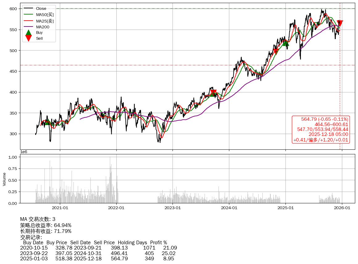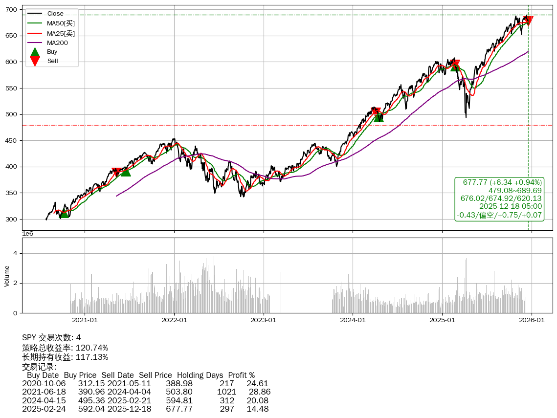 | 24 | ★SPY | $676.48(+5.18 +0.77%) 12-18 14:59 671.30 12-17 | 📈涨破 MA25/50 均线 📉回撤 12-11 -1.65% (6天) 689.15(12-10)→671.43(12-16) | +120.74% | +117.13% | +3.61% | 4 | 偏空/0.75/0.07 | 2020-07-27~2025-12-18 |