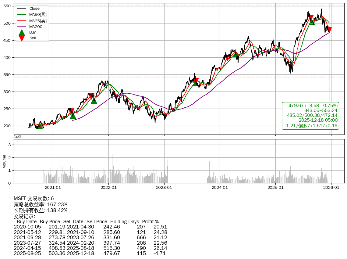 | 16 | ★MSFT | $483.88(+7.80 +1.64%) 12-18 14:59 476.08 12-17 | 📈涨破 MA5 均线 📉回撤 10-29 -11.40% (49天) 541.40(10-28)→472.19(11-20) | +167.23% | +138.42% | +28.82% | 6 | 偏多/1.51/0.19 | 2020-07-27~2025-12-18 |